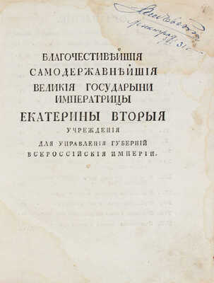 Благочестивейшия самодержавнейшия великия государыни императрицы Екатерины Вторыя Учреждения для управления губерний Всероссийския империи. [М.: Сенат. тип., не ранее 1776].