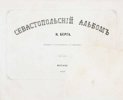 Уникальная подборка двухтомного труда «Записки об осаде Севастополя» и дополняющий его «Севастопольский альбом», составленный русским историком и художником Николаем Васильевичем Бергом (1824—1884). Книга основана на личных впечатлениях автора и содержит два раскладных плана: план сражения на Черной речке 4 августа 1855 г. и план укреплений Малахова кургана. Альбом представляет собой первое подобное издание, посвященное Крымской войне и обороне Севастополя. Во время Крымской войны 1853—1856 гг. Н.В. Берг служил в Севастополе сначала в 4-м Казначейском отделении, где заведовал наградами, затем состоял переводчиком при Штабе главнокомандующего. Участвовал в сражении на Черной речке, жил в бастионах во время осады
