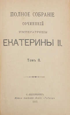 Екатерина II (Императрица Российская). Полное собрание сочинений императрицы Екатерины II. [В 2 т.]. Т. 1–2. СПб.: Изд. книжного склада «Родина», 1893.