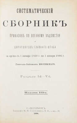 Систематический сборник приказов по Военному ведомству и циркуляров Главного штаба за время с 1 января 1869 г. по 1 января 1896 г. Разделы I-й – V-й / генерал-лейтенанта Коссинского. 3-е изд. СПб.: Тип. М.М. Стасюлевича, 1896.