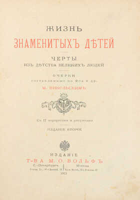 3. Никольский М.Н. Жизнь знаменитых детей. Черты из детства великих людей / Очерки, сост. по Фоа и др. М. Никольским; с 17 портр. и с рис. 2-е изд. СПб.; М.: Изд. Т-ва М.О. Вольф, 1912.
