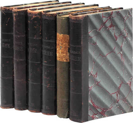 В полукожаных переплетах с «потухшим» золотым тиснением и суперэкслибрисом «М.Б.» на корешках. Т. 5 в составном переплете эпохи с бумажной наклейкой на корешке, владельческие и книготорговые пометы на свободном листе форзаца и нахзаце. Небольшие потертости переплетов. Тройные крапленые обрезы. Книжные блоки преимущественно чистые. В т. 1 слабый незначительный след от воздействия влаги на листе портрета. Сохранность хорошая