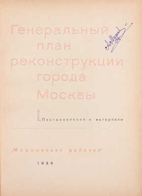 Генеральный план реконструкции города Москвы. 1. Постановления и материалы / Худож. оформ. С.Б. Телингатера. М.: Московский рабочий, 1936.