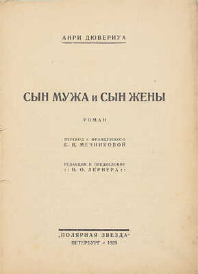 Дювернуа А. Сын мужа и сын жены. Роман / Пер. с фр. Е.В. Мечниковой; ред. и предисл. Н.О. Лернера. Пб.: Полярная звезда, 1923.
