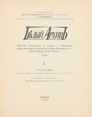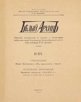 Белый архив. Сборник материалов по истории и литературе войны, революции, большевизма, белого движения и т.п. / Под ред. Я.М. Лисового. [В 3 т. Т. 1—3]. Париж, 1926—1928.