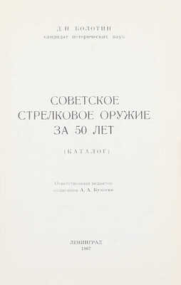 «Предлагаемый читателям труд историка-оружиеведа Д.Н. Болотина представляет собой первое серьезное исследование по истории развития советского стрелкового оружия за 50 лет. В нем глубоко и всесторонне освещаются вопросы создания и принятия на вооружение новых образцов военной техники на базе растущей социалистической экономики с целью укрепления обороноспособности страны»