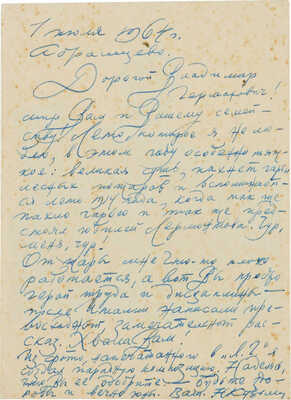 Под изображением «Fecit N. Kuzmin», на оборотной стороне: «1 июля 1964 г. Абрамцево. Дорогой Владимир Германович! Мир Вам и Вашему семейству! Лето, которое я не люблю, в этом году особенно тяжкое: великая сушь, пахнет гарью лесных пожаров и вспоминается лето