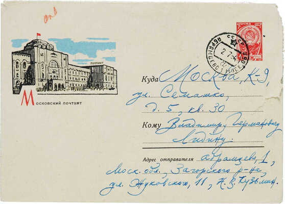 На конверте указан адрес: «Москва, К-9, ул. Семашко, д. 5, кв. 30. Владимиру Германовичу Лидину», обратный адрес: «Абрамцево, 1, Моск. обл. Загорского р-на, ул. Жуковского, 11, Н. В. Кузьмин»