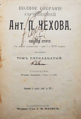 [Чехов А.П., автограф]. Полное собрание сочинений Ант. П. Чехова. Издание второе. Т. 15. СПб.: Издание Т-ва А.Ф. Маркса, 1903.