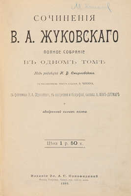 Жуковский В.А. Сочинения В.А. Жуковского, полное собрание в одном томе / Под ред. П.В. Смирновского; с рис. в тексте худ. А. Чикина, с факсимиле В.А. Жуковского, с портретами и биографией, сост. А. Фон-Дитмар и одобренной сыном поэта. М.: Издание 2-е А.С. Панафидиной, 1905.