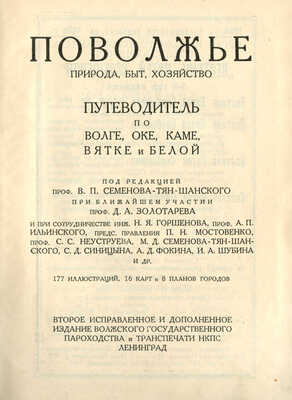 Поволжье. Природа, быт, хозяйство. Путеводитель по Волге, Оке, Каме, Вятке и Белой / Под ред. проф. В.П. Семёнова-Тян-Шанского при ближайшем участии проф. Д.А. Золотарева [и др.]. 2-е, испр. и доп. изд. Л.: Издание Волжского государственного пароходства и транспечати НКПС, [1926].
