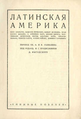 Латинская Америка: [Сборник рассказов] / Хосе Альварес, Мануэль Бернардес, Хавьер де-Виана ... [и др.]; пер. Ек. Б. и В. Рахманова; под ред. и с предисл. Д. Выгодского. Л.: [Прибой], [1927].
