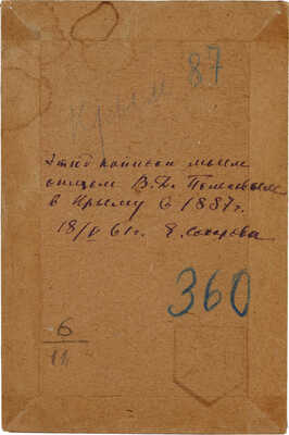 На обороте удостоверяющая надпись дочери художника, штамп-монограмма В.Д. Поленова