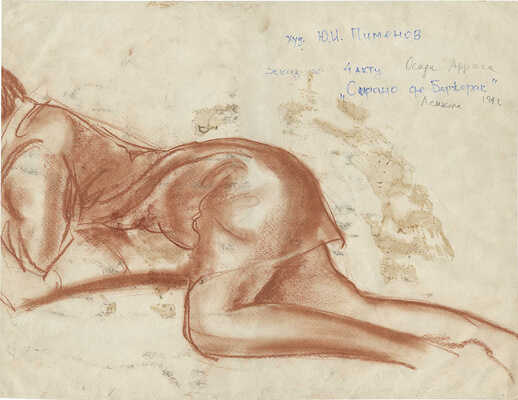 Пименов Юрий Иванович (1903-1977) - действительный член АХ СССР (1962), народный художник СССР (1962), заслуженный деятель искусств РСФСР (1957). Учился во ВХУТЕМАСе у С.В. Малютина, В.Д. Фалилеева, М.Ф. Шемякина, В.А. Фаворского. Один из организаторов общества художников «ОСТ» (1925). Лауреат Ленинской премии 1967 г. за серию картин «Новые кварталы», лауреат Государственных премий 1947 и 1950 гг. за театральные декорации. Получил золотую медаль за панно «Стахановское движение» в советском павильоне на Международной выставке в Париже 1937 г. В конце 1930-х - начале 1940-х гг. создал серии иллюстраций к книгам С.Я. Маршака, В.В. Маяковского, С.В. Михалкова. В 1958 г. совершил поездки в Италию, Францию, Грецию. В 1965 г. о нем был снят документальный фильм «Поэзия обыкновенного (художник Ю. Пименов)». Произведения хранятся в ГТГ, ГРМ, ГЦТМ им. А.А. Бахрушина