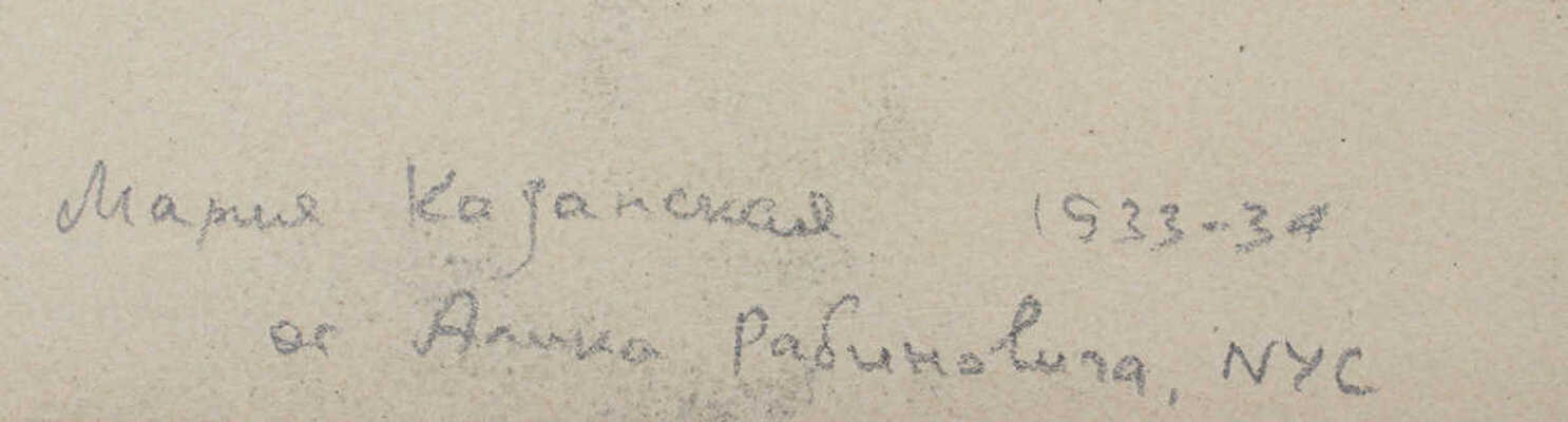 Казанская Мария Борисовна (1914-1942) - советский художник-живописец. Ученица В.М. Ермолаевой. Начала рисовать в возрасте трех лет. Окончив 9 классов школы, в 1931 г. начала систематические занятия живописью. По совету В.В. Лебедева пришла в мастерскую В.М. Ермолаевой, где обучалась в 1929-1934 гг., и одновременно училась в АХ у А.А. Осмеркина. Она входила в «домашний круг» К.С. Малевича, дружила с К.И. Рождественским. Была близка к группе художников «живописно-пластического реализма» (объединявшей К.И. Рождественского, В.В. Стерлигова, В.М. Ермолаеву, Л.А. Юдина и других художников). Была арестована как «участник контрреволюционной группировки, пытающейся наладить нелегальную связь с заграницей и ведущей антисоветскую пропаганду среди окружающих». После ареста прекратила занятия живописью