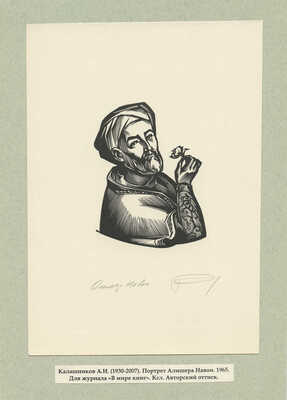 Калашников Анатолий Иванович (1930-2005) - советский художник-график, автор гравюр на дереве для почтовых марок и экслибрисов. Заслуженный художник РСФСР. Стал первым русским художником, который был избран почетным членом Королевского общества художников-графиков Великобритании. Награжден именной серебряной медалью папы Иоанна Павла II. В 1943 г. начал заниматься в изостудии Дворца культуры Московского автозавода. В 1949 г. окончил МВХПУ (бывшее Строгановское), отделение художественной обработки металла. Его учителями были мастера репродуктивной школы гравюры на дереве Д.Г. Соболев, академик И.Н. Павлов, профессор М.В. Маторин. После окончания училища стал работать художником-конструктором на Московском автозаводе, но вскоре перешел в издательство «Советский писатель» на должность художественного редактора. В 1953 г. оставил штатную работу и стал сотрудничать с многими московскими издательствами. В начале 1960-х гг. порвал с репродуктивной школой, создав серию абстрактных иллюстраций для коллекционного издания произведений Ф.М. Достоевского. Гравюры вызвали восхищение, но так и не были опубликованы издательством, которое посчитало их «опережающими время». Создал более 1000 гравюр, включая несколько эпических тематических серий. Графические работы представлены в Британском музее, а также в некоторых музеях и картинных галереях бывшего СССР