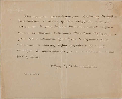 Фихтенгольц Г.М. [Рукописная записка]. 31.12.1923.