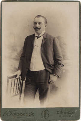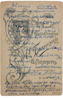 Наклеена на фирменное паспарту. На обороте фотографии рукой В.Г. Лидина: «Евгений Мищук / бывший начальник / киевской сыскной / полиции, показания / которого сыграли / решающую роль / для оправдания / Бейлиса. / При советской власти / получал персональную / пенсию. / Последние годы жил / в Боровицах Новгород. / области. / За свои показания на процессе / Бейлиса был приговорен к / заключению в крепости; впослед- / ствии помилован»