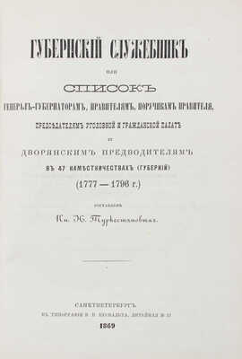 Туркестанов Н. Губернский служебник, или Список генерал-губернаторам, правителям, поручикам правителя, председателям уголовной и гражданской палат и дворянским предводителям в 47 наместничествах (губерний) (1777—1796 гг.). СПб.: Тип. В.В. Нусвальта, 1869.