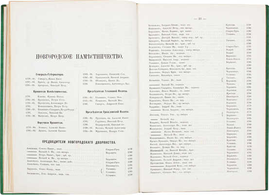 Полная роспись всех должностных лиц в наместничествах — административно-территориальных единицах Российской империи, существовавших в 1778—1796 гг. и объединявших 2—3 губернии. Сотни фамилий с указанием должностей и годов службы распределены по наместничествам и отдельным городам и городкам. С посвящением князю М.А. Оболенскому. По словам автора, князя Николая Николаевича Туркестанова, книга послужит «руководством для любителей старины, и будет приятно потомкам вспомнить служебную деятельность своих дедов».