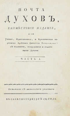 [Библиографическая редкость]. Почта духов, ежемесячное издание, или ученая, нравственная и критическая переписка арабского философа Маликульмулька с водяными, воздушными и подземными духами / [Изд. И.А. Крыловым]. [В 2 ч.]. Ч. 1. СПб., 1789.