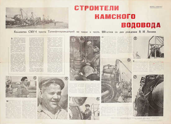 [Нефтяная промышленность Татарстана]. Строители Камского водовода. Коллектив СМУ-4 треста Татнефтепроводстрой на вахте в честь 100-летия со дня рождения В.И. Ленина. [Фото-плакат] / Текст и фото С.Н. Андреева-Арского. [Альметьевск]: Альметьевская гор. тип., 1969.